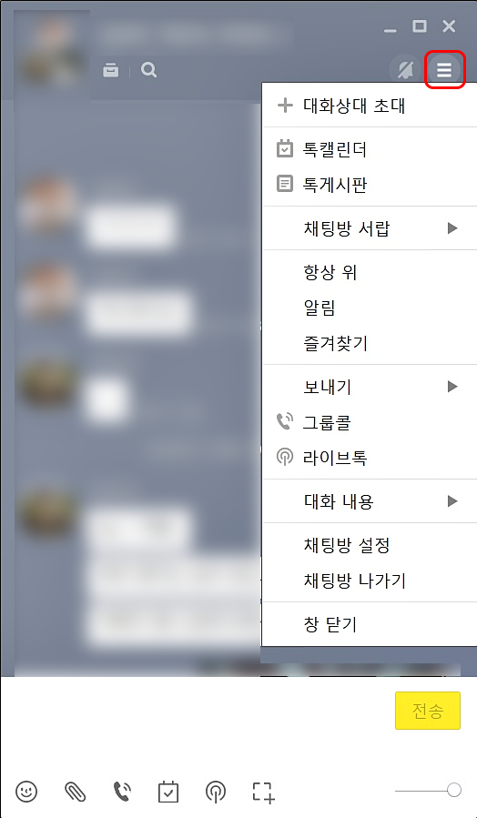 한번씩 눌러보시면서 다양한 기능을 이용해보시는 것을 추천드리는데요. 특히 많이 이용하실만한 기능은 "채팅방 서랍" 기능이라고 생각합니다. 이 기능은 왼쪽 위에 있는 돋보기 왼쪽 서랍을 누르셔도 동일하게 이용하실 수 있습니다.
