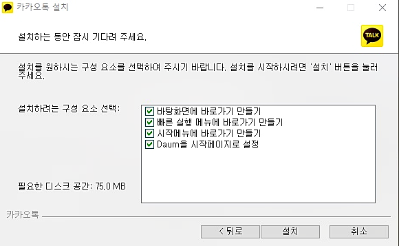 그리고 구성 요소에 대해서는 원하시는 부분들만 체크해주시면 되는데요. 다 귀찮으신 분들은 바탕화면에 바로가기 만들기 하나만 체크하셔도 괜찮습니다. 카카오톡 PC버전을 이용해보시면 아시겠지만, PC를 켠 후 종료할 때까지 카카오톡이 켜져있다고 보셔도 됩니다.