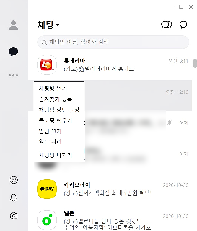 이것도 제가 많이 이용하는 기능인데요. 채팅방에서 주로 대화하는 친구가 있거나, 관심이 있는 채널이나 단톡방이 있다면 채팅방 상단에 고정시켜 놓을 수 있습니다. 이렇게 원하시는 채팅방에 마우스 우클릭을 하시면 "채팅방 상단 고정"이라는 기능이 있습니다.